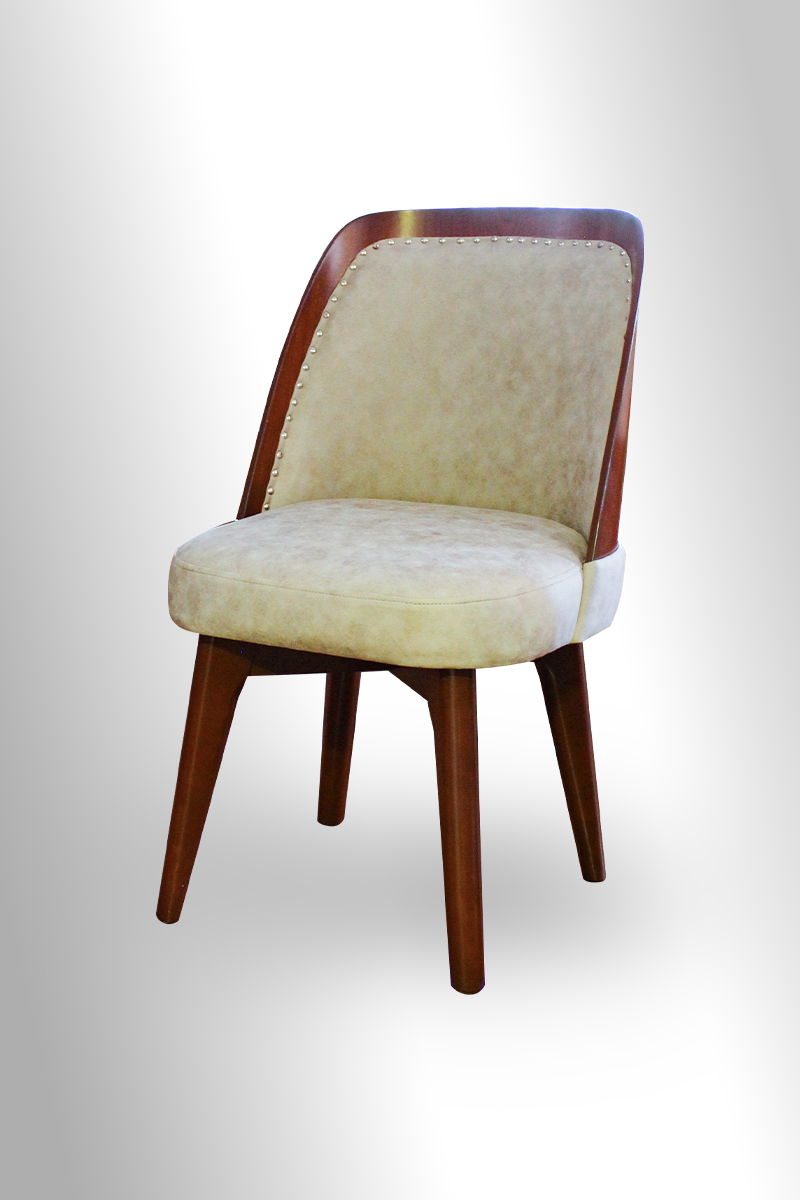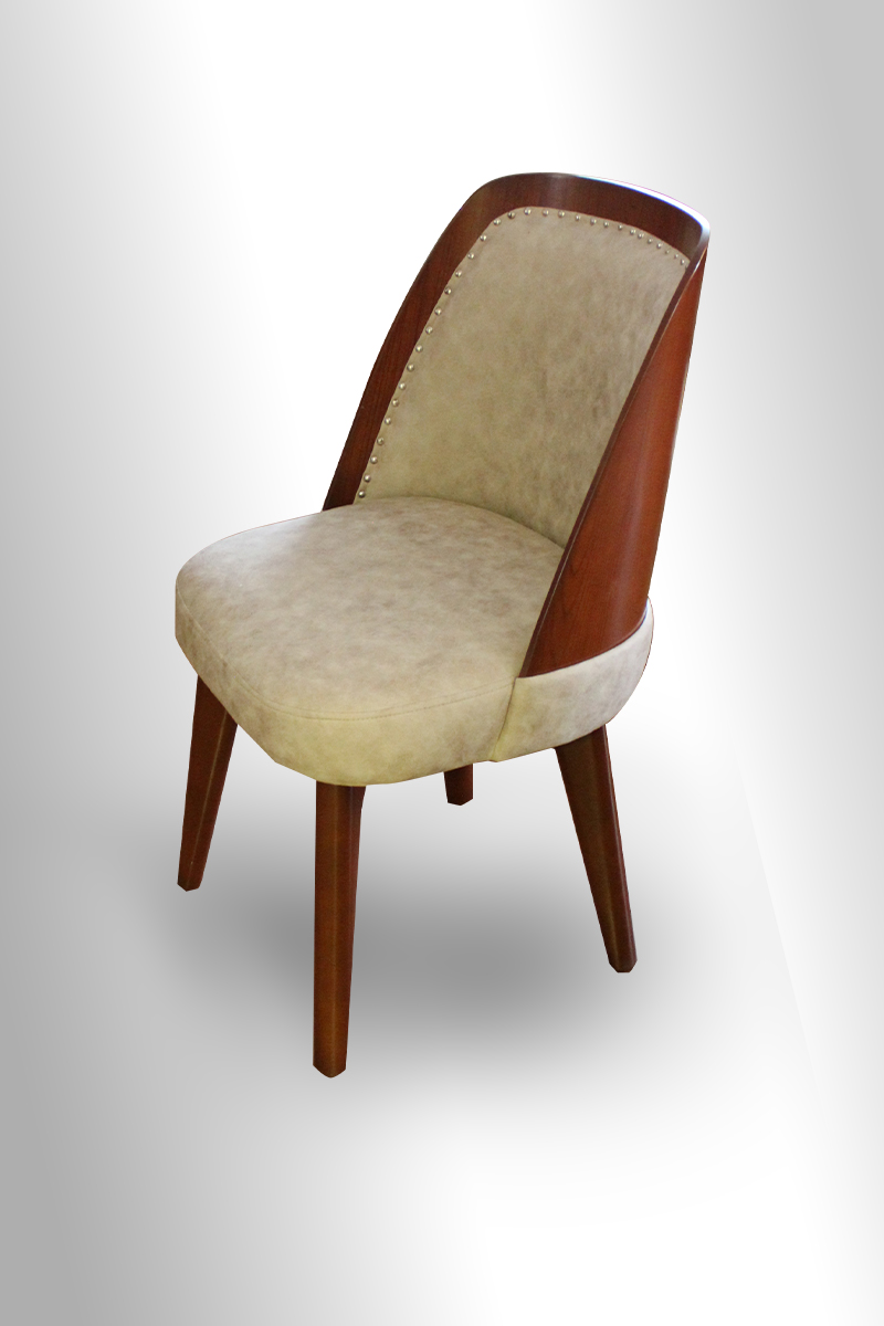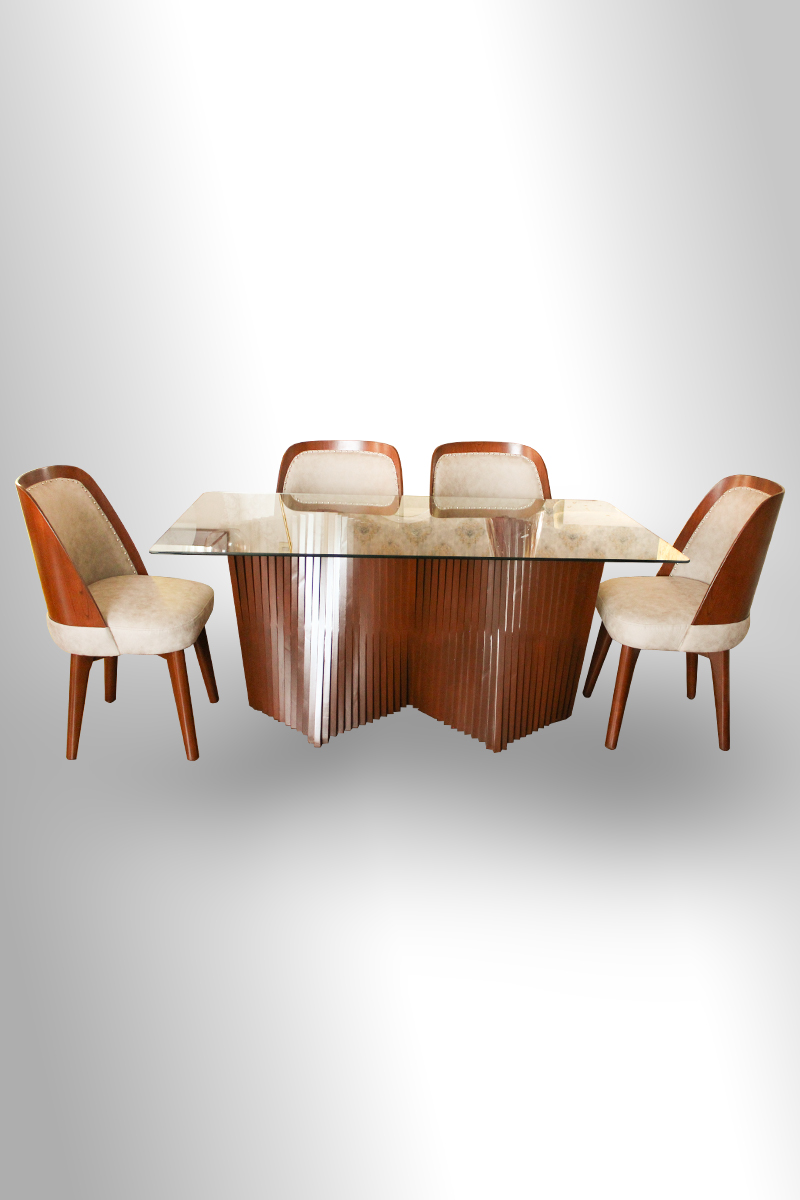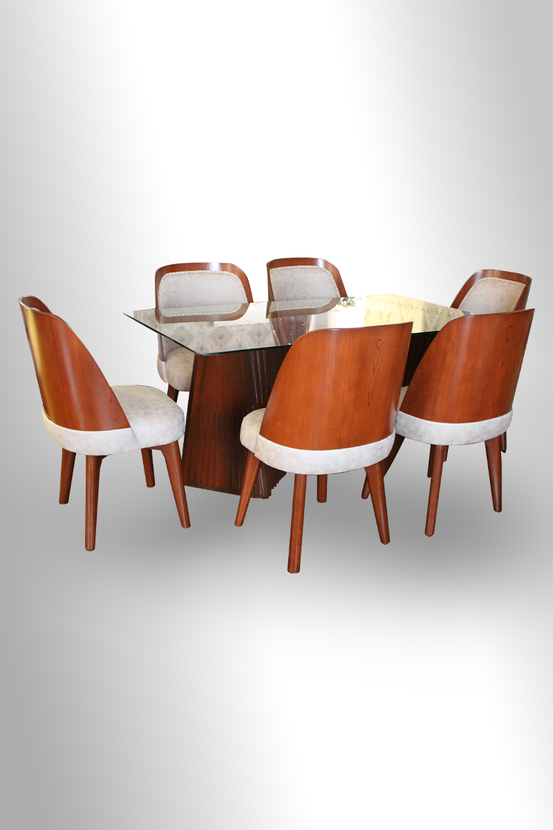 Juego de comedor con la base estilo guirnalda de pura madera tapa de vidrio templado de 10 mm. Sillas estilo poltronas diseño curvo en el respaldo y el asiento tapizado en pura madera con acabado mara rojizo.